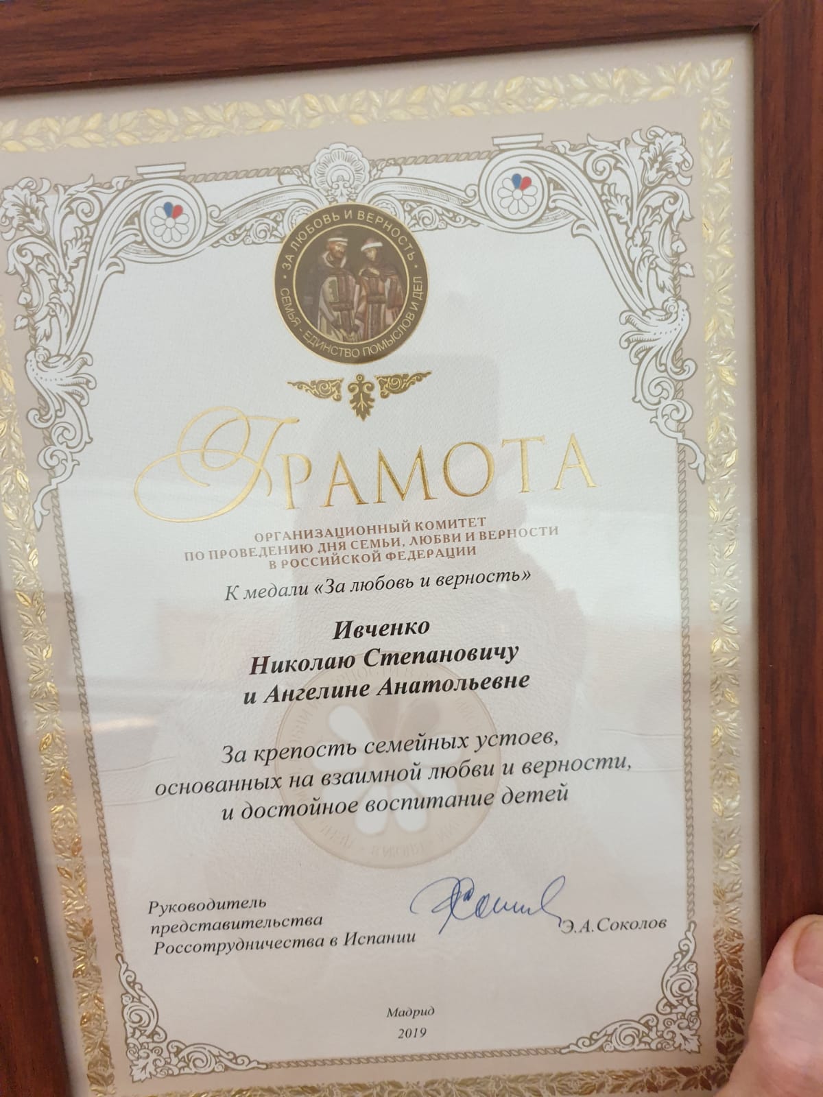 Медаль "За любовь и верность!" семье Ивченко. Медаль «За любовь и верность» является общественной наградой, учрежденной Организационным комитетом по проведению «Дня семьи, любви и верности в Российской Федерации». Медалью награждаются граждане Российской Федерации и граждане иностранных государств – супруги, зарегистрировавшие заключение брака не менее 25-ти лет назад, получившие известность среди сограждан крепостью семейных устоев, основанных на взаимной любви и верности, а также добившиеся благополучия, обеспеченного совместным трудом, воспитавшие детей достойными членами общества.